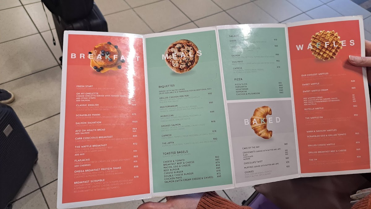 Drinks range from vibrant orange juice and caramel milkshakes to more unusual offerings like the red cappuccino latte, complementing the cozy and welcoming atmosphere of the café. The menu suits a range of tastes and times, encouraging guests to take a moment of comfort amidst the busy surroundings of the airport.